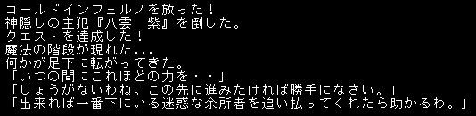 6発目のコールドインフェルノを使って『八雲 紫』さんを撃破。冷気の耐性が無かったから助かったあ。@から魔力の嵐以上の遠距離魔法を連打されるなんて八雲さんも迷惑だったろうな。