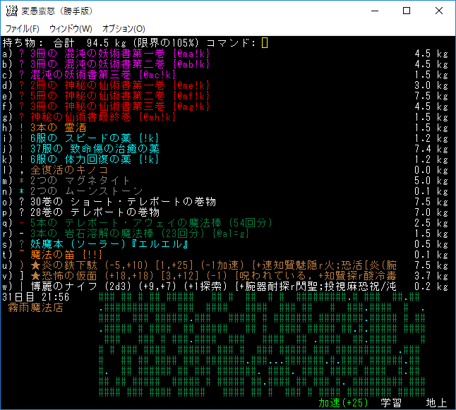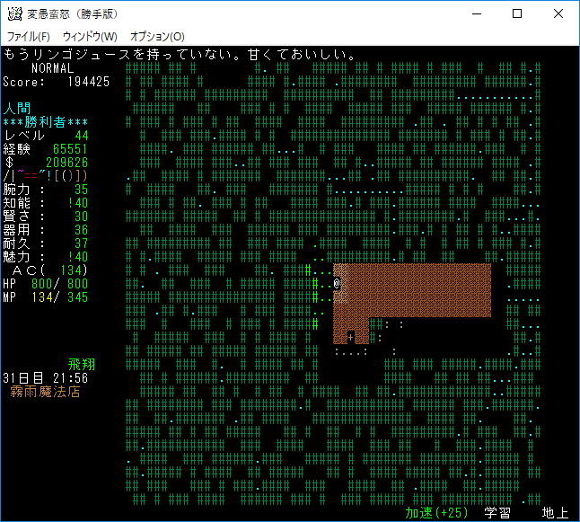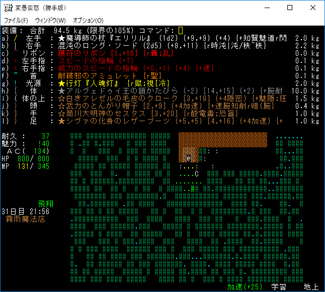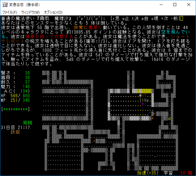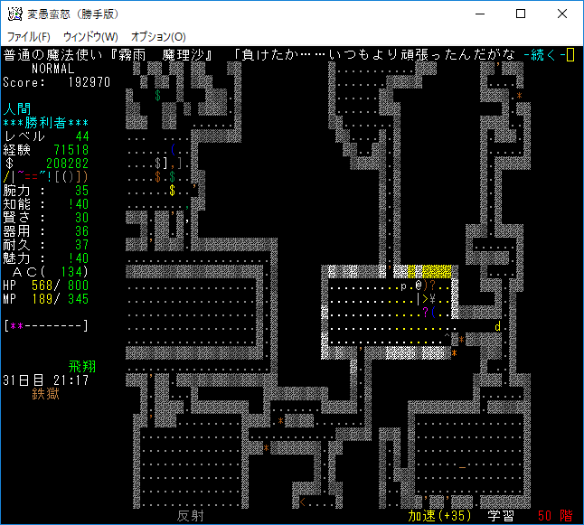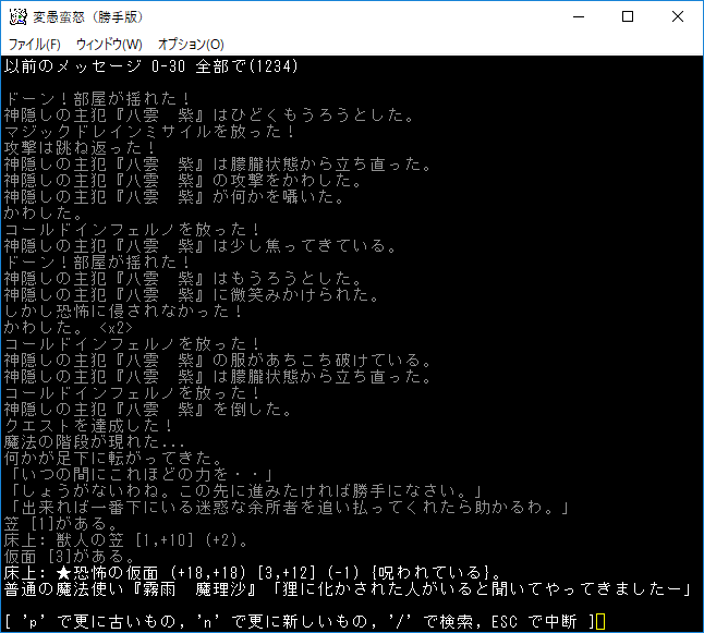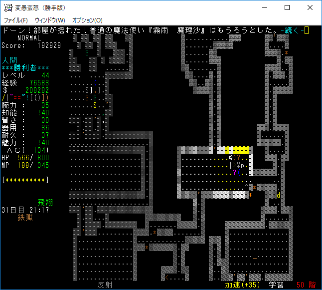 なんとか『霧雨魔理沙』を倒しました。地下70階くらいなら問答無用で*破壊*する局面だったな。ユニークと2連戦をして疲れた。人里に帰還をします。