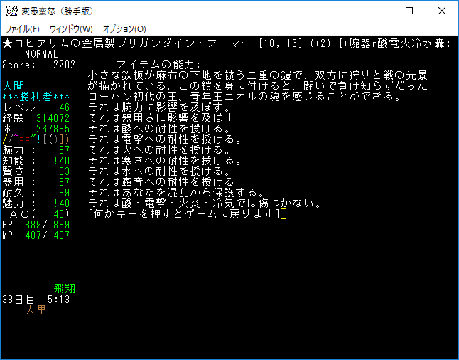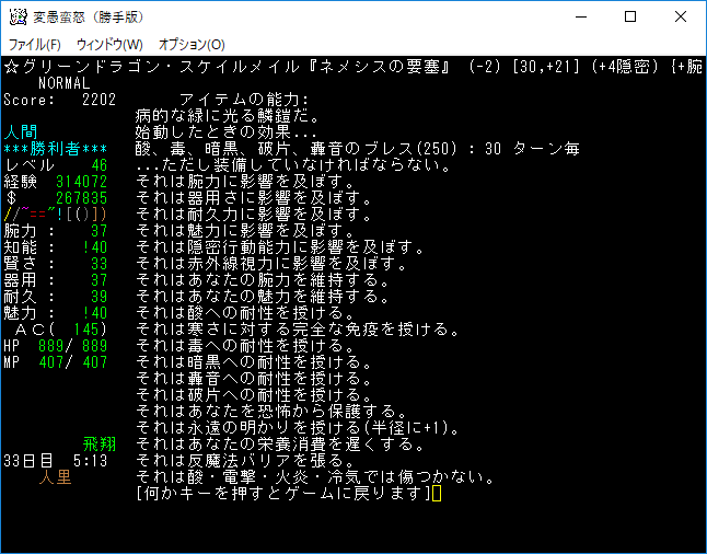 そんなわけでスピードの指輪を拾って人里に帰還。グリーンドラゴン・スケイルメイルがランダムアーティファクトでした。ちょっと性能を見てみよう。