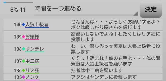 共有者プレイで霊ロラ進行はきつい。2人の霊能者を吊るまでに相方と自分が噛まれてしまう。いま行われている●吊りに参加できないじゃないか。1日目に霊ロラではなく●吊り(ライン戦?)を主張すれば、また違った形で活躍できたのだろうか。次にいきます。