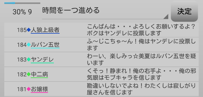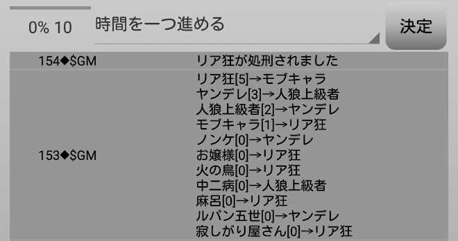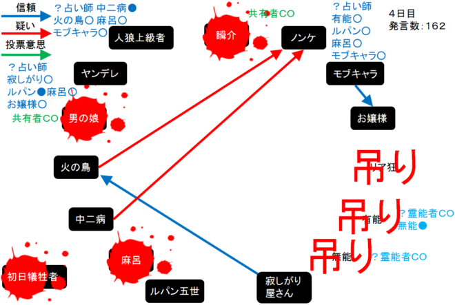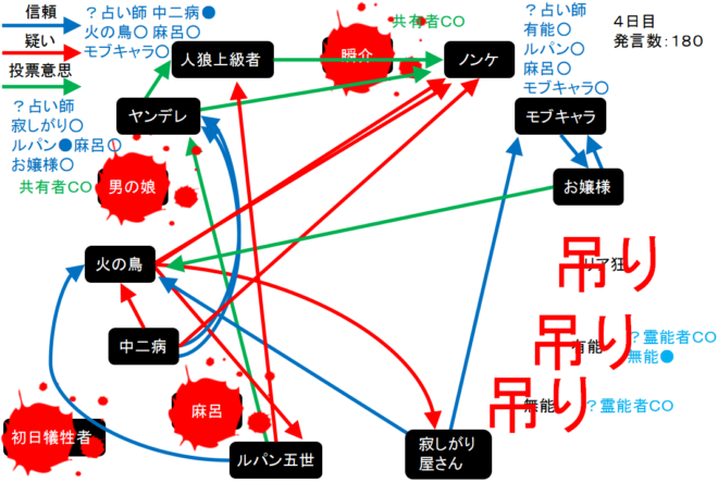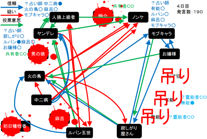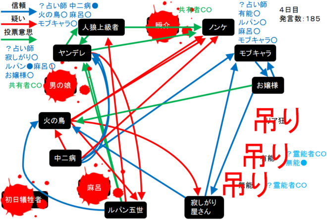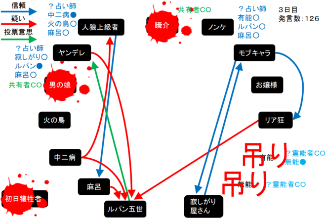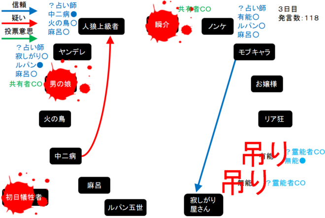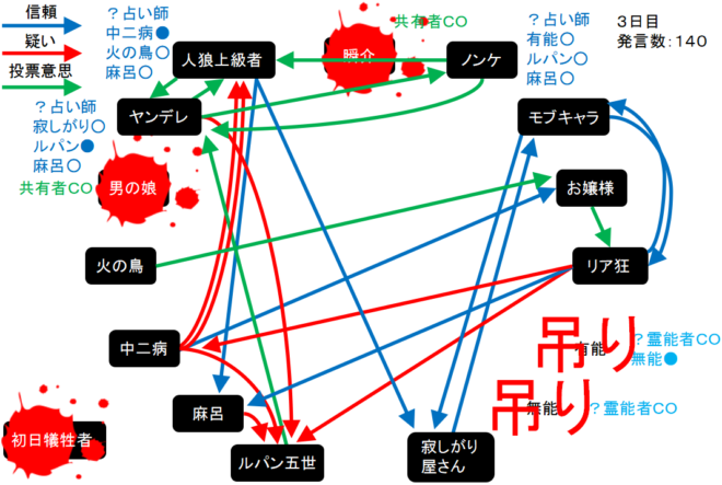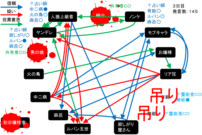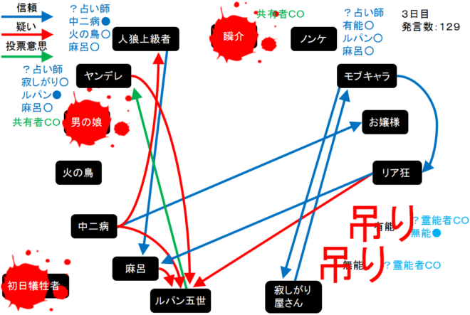3日目の投票を見ればヤンデレが真占い師なのは明白だったからな。ヤンデレが信頼されてヤンデレに占われたお嬢様が信頼されるという図か。残りの人狼はノンケとルパンに違いないけど妖狐がわからん。次にいきます。