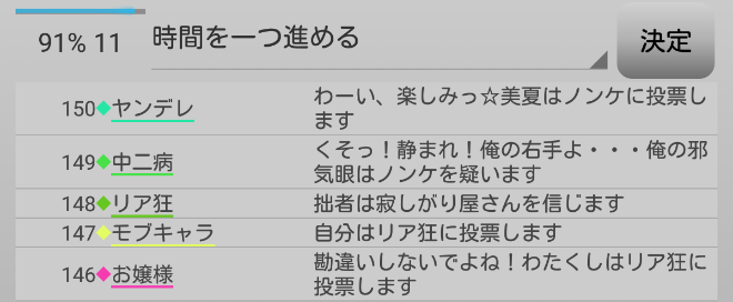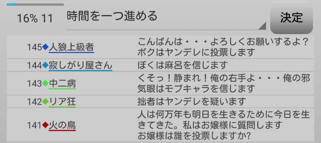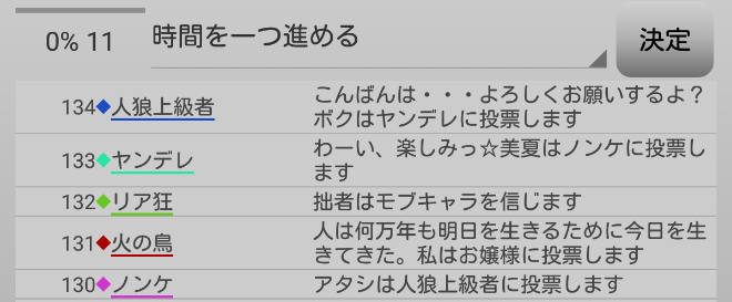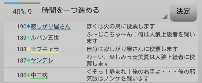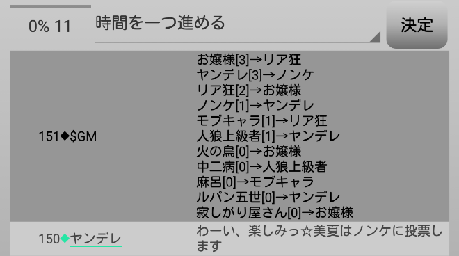 村人の票がまとまらない。ヤンデレが3票入れられて吊られてしまうぞ。火の鳥へも2票確定しているけど、中二病は●を出された人狼上級者へ投票するだろうし、モブキャラは寂しがり屋さん投票だ。もしかしてモブキャラが妖狐?