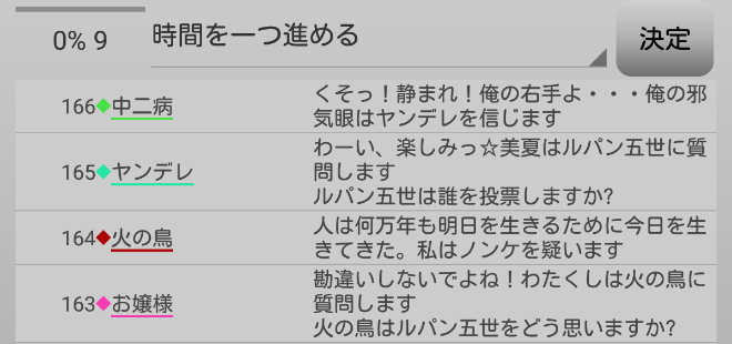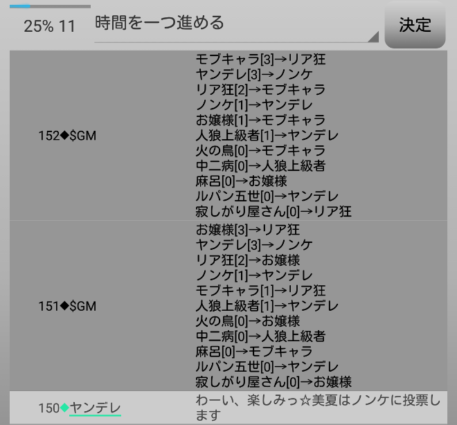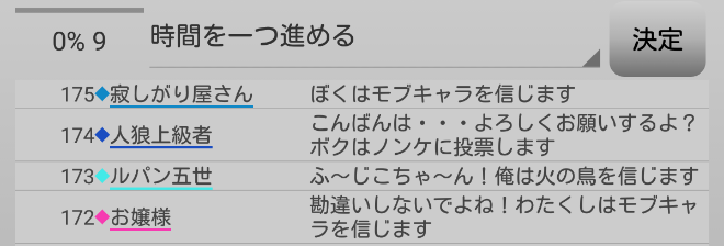あれ?お嬢様が火の鳥に投票意思を示した。そして中二病も火の鳥を疑っている。確かに火の鳥はノンケとルパンを疑っておきながらヤンデレの○である寂しがり屋さんを疑っており怪しい。次にいきます。