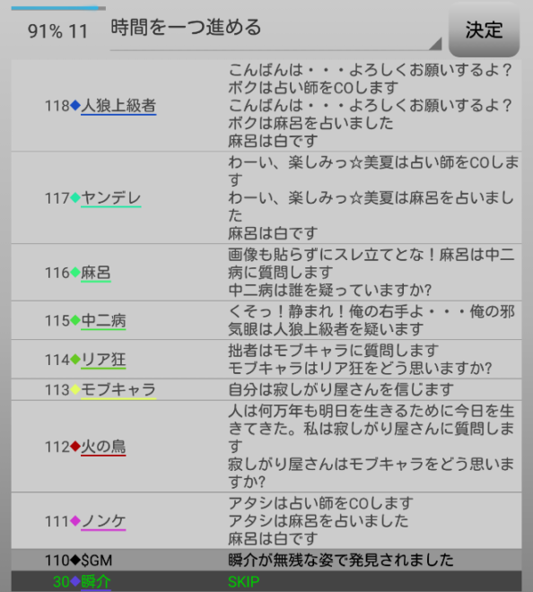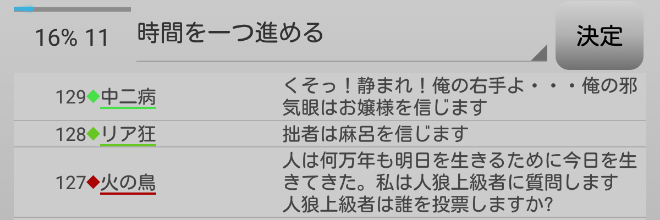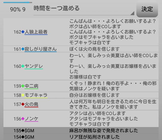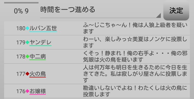 火の鳥が人狼を疑いまくって議論を引っ張っているな(笑)。火の鳥は占い結果も重視するし発言回数も多めに設定されているので優秀だ。辛口のガンガン攻めるプレイヤーだよね。次にいきます。