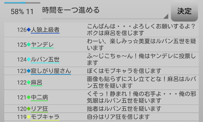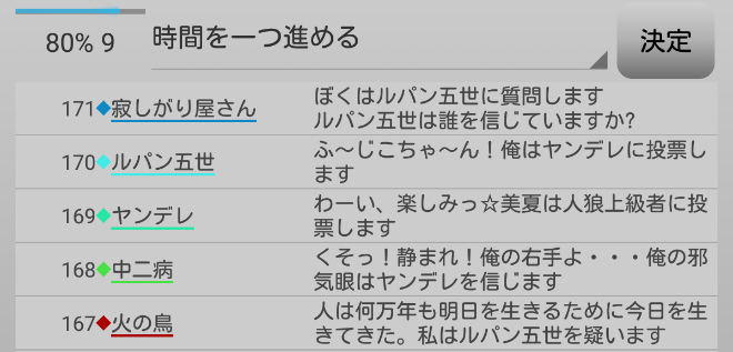 今日は誰を吊るんだろう。疑い先が集まっているルパンかなあ。次にいきます。