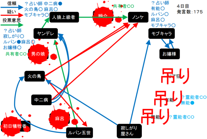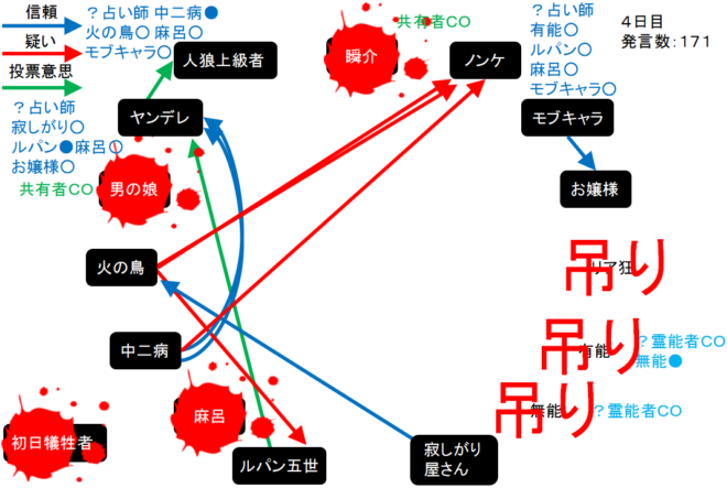 ヤンデレ(たぶん真占い師)が処刑された。中盤の真占い師吊りは妖狐が勝利するパターンじゃないの?共有者として4日目の議論に参加したかった。どうすれば参加できたんだろう。ずっと潜伏していれば良かったのかな(泣)。