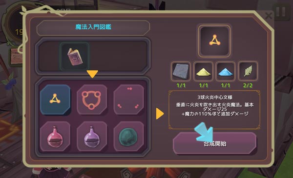 どうやら『3球火炎の中心文様』が合成できるらしい。パイベリーが『ぜーんぶ、燃やす!』と息巻いていた炎の魔法ですよね(笑)。えーと、怖いけど合成をします。