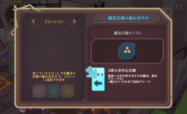 1つのスロットには3つしか魔法を入れられないのか。まあ魔法は1つしかないからどうでもいいや(笑)。スロット1に『3球火炎中心文様』を入れまーす!