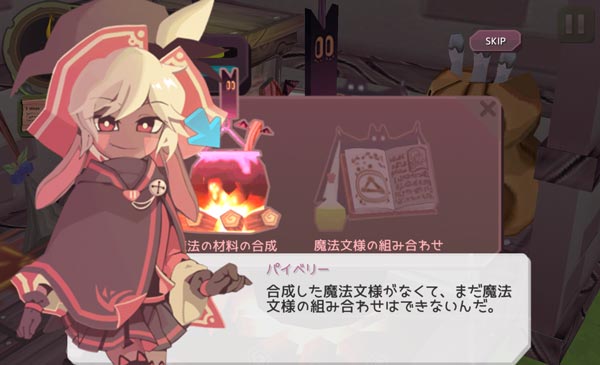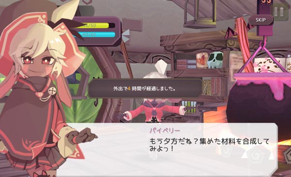 外出をすると4時間が経過するようです。もっと遠出をすると時間は増えるのかな?まあいいや、パイベリーに言われたとおり材料を合成します。