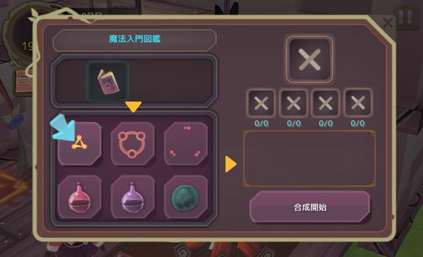 矢印に従い『魔法材料の合成』を行います。右側にある『魔法文様の組み合わせ』はできないようですね。『魔法文様の組み合わせ』って何だろう?