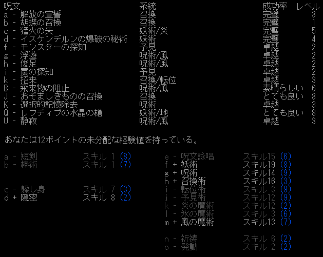 スキル経験値は妖術につぎ込もう。ゾットのオーブを拾うまでにレフディブの水晶の槍を詠唱可能にしなければいけない。ほんのちょっと召喚術も上げたいと思っています。何度もおぞ(略)の召喚を詠唱することになるから成功率を上昇させよう。浮遊をしていても召換ファンブルをくらったら変な場所にテレポートして死ぬから。