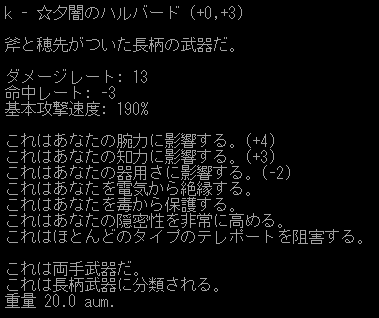 3つのアーティファクト武器をアクセサリーとして持っていきます。☆夕闇のハルバードはテレポート阻害が欲しかったから。ゾットの領域5階は罠を通らなければ先に進めない構造になっています。テレポートの罠が設置されていた場合はこれを装備する。