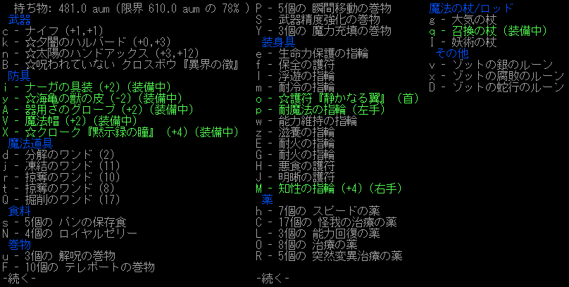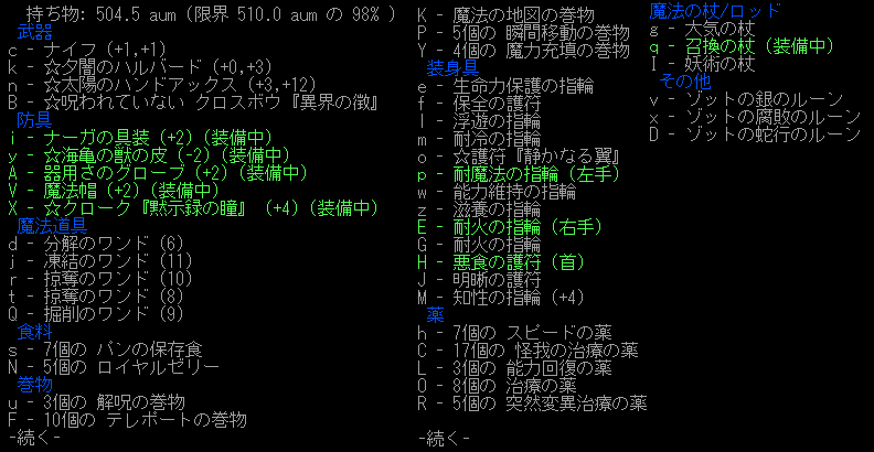 あまり変わってないけど現在のアイテム。はやく知性の指輪を耐火の指輪に変えろ!おぞ(略)の召換は腹が減るからちょっと食料が心配。
