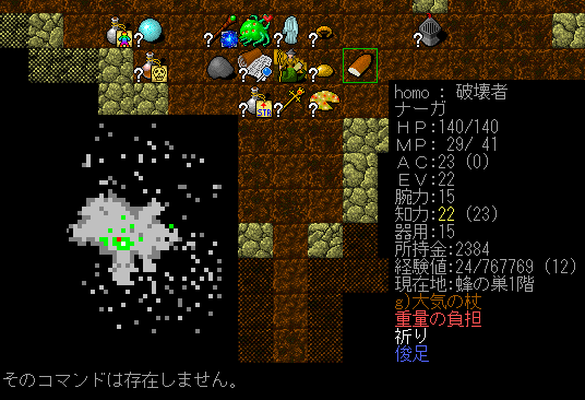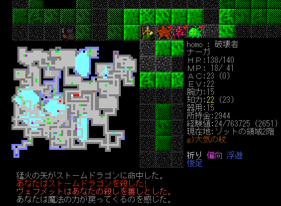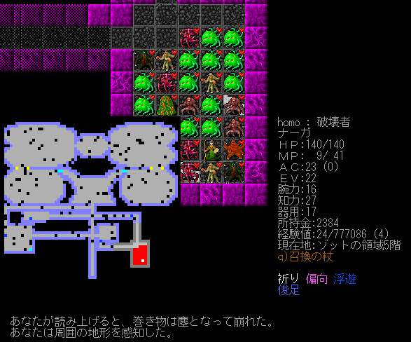敵になった触手の怪物を倒しました。上の階(地下14階)はvaultがあったから召換獣が大勢いるのです。触手の怪物さんごめんなさい。悪いのは殲滅の魔法書なのに。