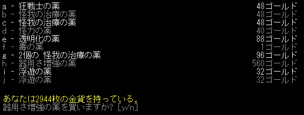 金貨の使い道がありません。器用さ増強の薬が売っていたから買ってしまおうか。怪我治療の薬は余っています。