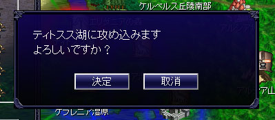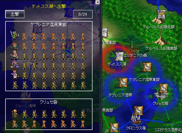 それではティトスス湖へ進軍をしましょう。隊列は8と少なめです。戦力が少なければ敵の方から向かってきてくれるかも(守勢の方が戦いやすい)。敵が動かなくても遠距離魔法で何とかします。