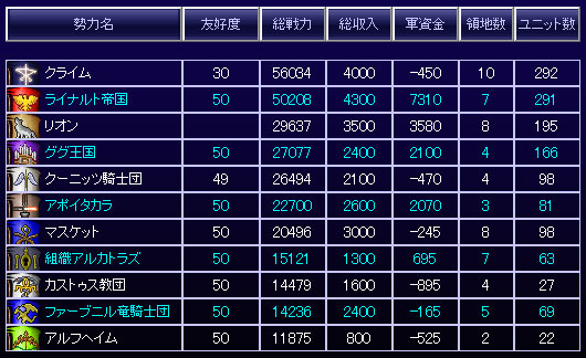 領地は増えた。しかし総戦力が低すぎる。帝国の足下にも及ばないし他勢力に追いつかれそう。対リオン同盟を組まれたら滅亡だな。