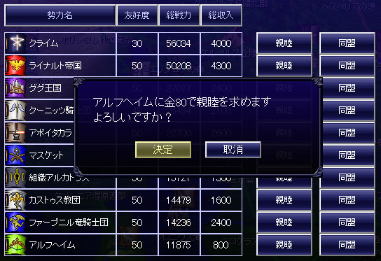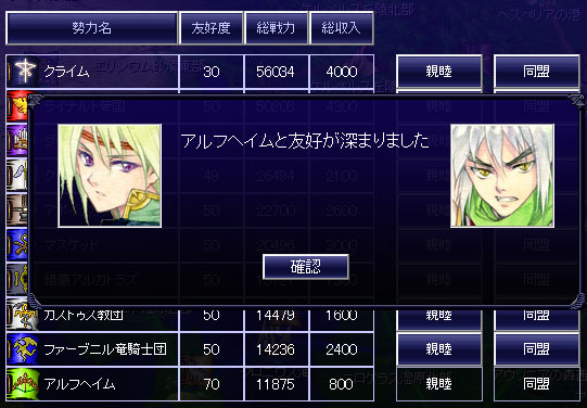 エルフが滅亡をしたら帝国と戦う羽目になる。お金を送って応援をしておこう。友好度が上がれば同盟をしても良い。何かの間違いでエルフと隣接をしたら人材ユニットを守備に回すことになります。
