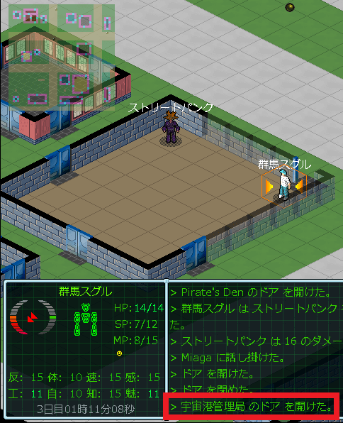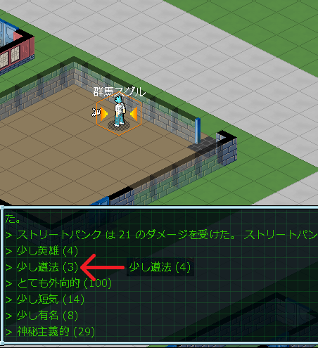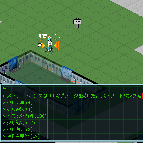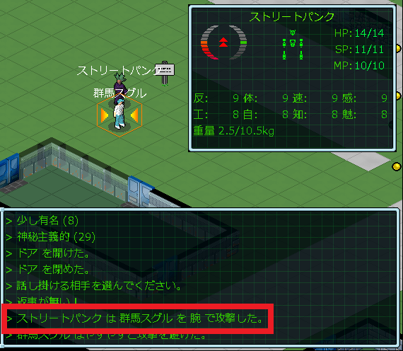 最寄りの建物に入ろうとしたら、いきなりNPCが攻撃してきやがった。ログによると「ストリートパンク」が僕ちゃんを殴ったようです。街の住人がいきなり襲撃してきたからマジでビビった。もしかしたら、このまま殺されてしまうのでは?