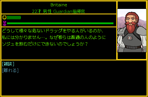 ガーディアン(警察)の支部の中には熊ヒゲのBritaineがいました。Britaineはガーディアンのボスみたいなものです。ガーディアンになりたいときは必要な条件を満たしてBritaineに話しかけてみましょう。ストリートパンクだらけの街で警察官をやるなんて苦労人のガチムチちゃんだよな。