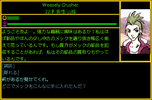 Honest Weaselの中にいたのは山賊の店主だった。店主の話によるとこの店ではメックの本体を販売しているらしい。会話や選択肢の文章から察するに、この山賊が販売しているメックは盗品なのだろう。つーか、メック用の武器とか補助系のパーツは購入できないの?