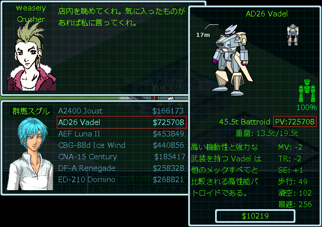 山賊の店主に品揃えを見せてもらったところ、初めて見かける強そうなメックを販売していました!くっそー!Vadelが格好良すぎるから欲しいのに70万円もしやがる。いつかお金を貯めたらVadelを買いたいなあ(泣)。このお店はメックの本体しか販売していないため、お金が足りなくて何も買えずに帰りました。