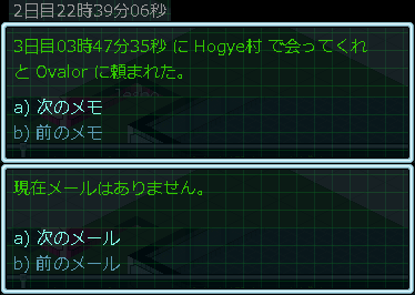 現在のメモとメールは上の画像。あと5時間でNPCのOvalorと待ち合わせた時間になる。おそらく次回の投稿にてOvalorと会うことになるだろう。たしか俺の命を狙っている奴らがいるんだっけ?強いメックと戦うイベントになったら嫌だなあ。