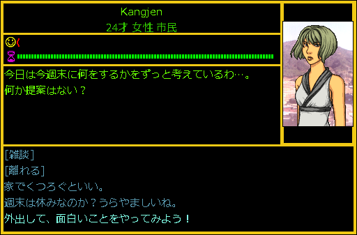 ウォーターフロントの施設を調べながら市民のNPCにも話しかけたりしました。NPCによっては会話の時に特別な選択肢が表示された者もいた。例えば上の画像のように週末の過ごし方を考えている女性が現われたりしたのだ。これは正しい選択肢を選ぶと汎用イベントが始まって報酬を貰えるのかな?