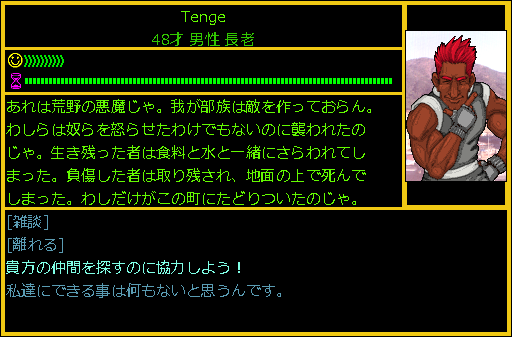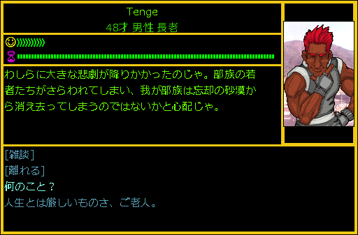 かなり深刻な話なので詳細を聞いてみましょう。Tengeの部族を襲撃したのは「荒野の悪魔」という者だそうです。Tengeの部族は誰かに恨まれるような覚えはない。それなのに若者たちは殺されたり、あるいはさらわれてしまったのです。生きてウォーターフロントにたどり着いたのは長老であるTengeだけでした。
