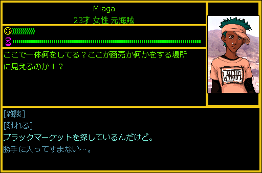Pritate's Denの店主は元海賊のMiagaだった。Miagaに話しかけたら、いきなり「ここで一体何をしている!?」と怒られてしまったよ。なるべく穏便に済むような選択肢を押します。