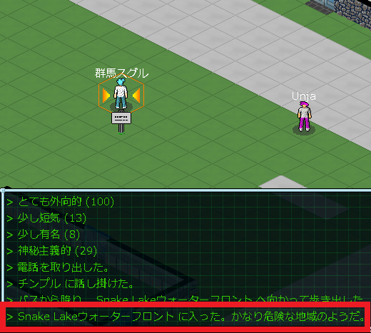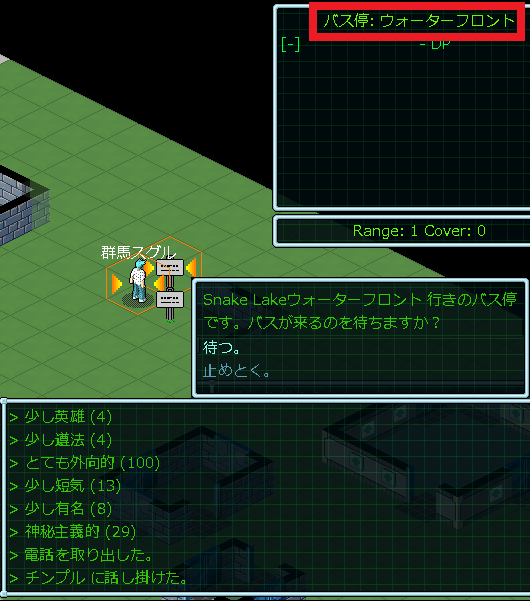 さて、バスに乗ってウォーターフロントに到着したわけだが、怪しい雰囲気の街だな。ゲーム画面のログに「かなり危険な地域のようだ」と表示されていやがる。こんな街を歩きたくないんだけど(笑)、繁華街に戻ってもやることが無いので我慢をするしかない。