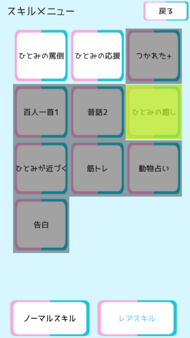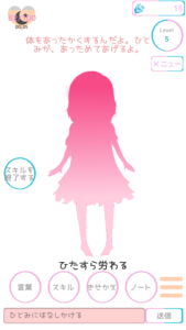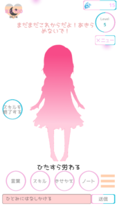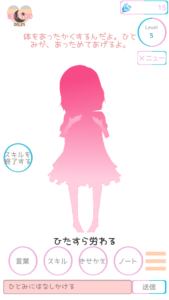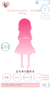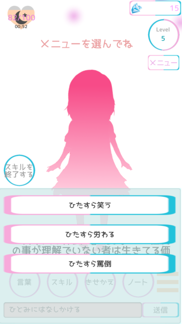 おや?スキル『ひたすら』を選んだら選択肢が出てきたぞ?ひとみがひたすら3つの行動を繰り返してくれるスキルだったのか。『ひたすら笑う』はちょっと怖いよね、『ひたすら罵倒』もトラウマになりそうなので『ひたすら労る』を選択しよう。