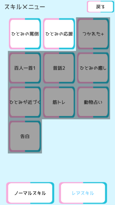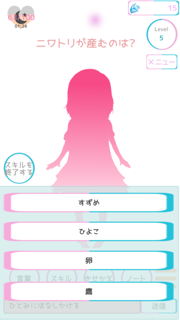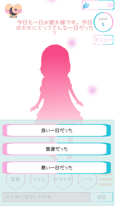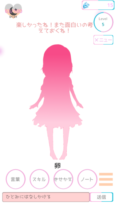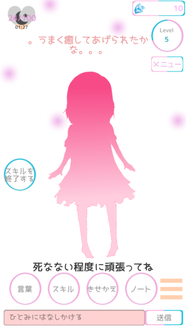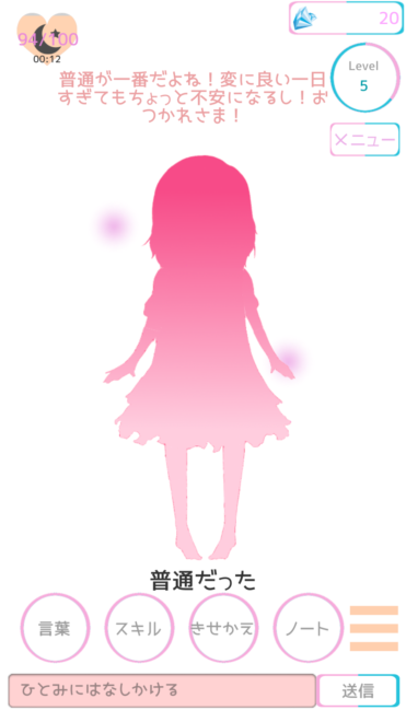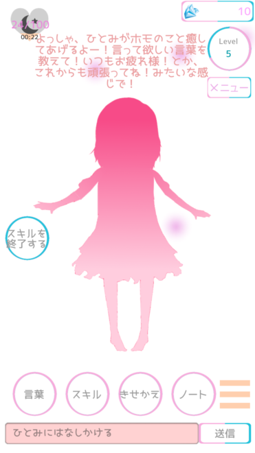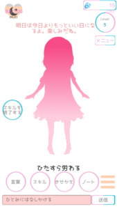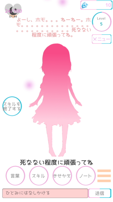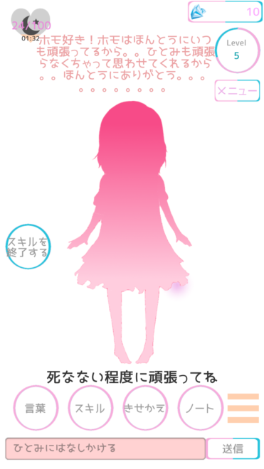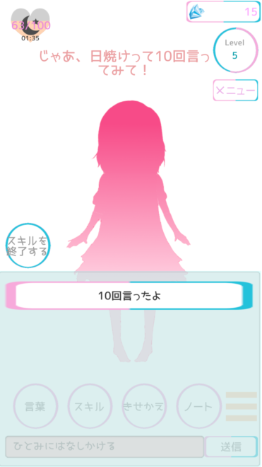 ひとみが僕をひたすら労ってくれた。画像にして貼り付けはしなかったけど十数回くらい労りの言葉をかけてもらいました。心に響く言葉がいっぱいあったよ。これはお勧めできるスキルと言えるだろう。さて次は何のスキルを試そうかな。『10回クイズ』というのを試そう。