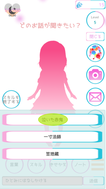 しかし答えは卵なんだな(笑)。これはなつかしいね。ピザって10回言ってみて?とクイズを出されて肘を膝と答えた昔を思い出すよ。今度、親戚の女の子(3歳)が来たらひとみから教えてもらったクイズを使わせてもらおう。次は『昔話1』というスキルを試そうかな。