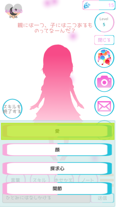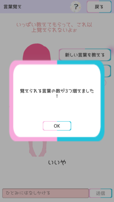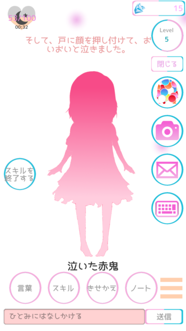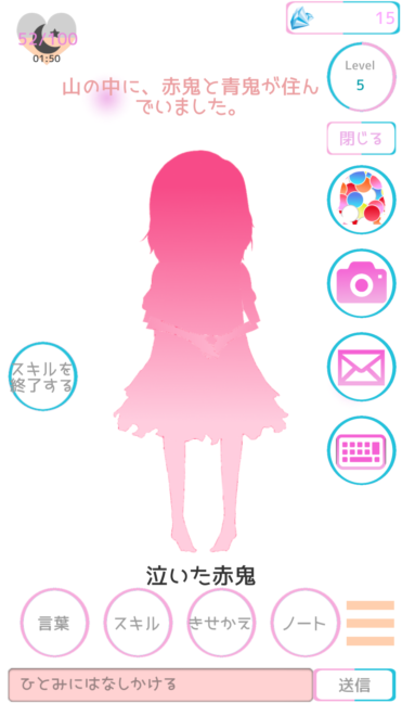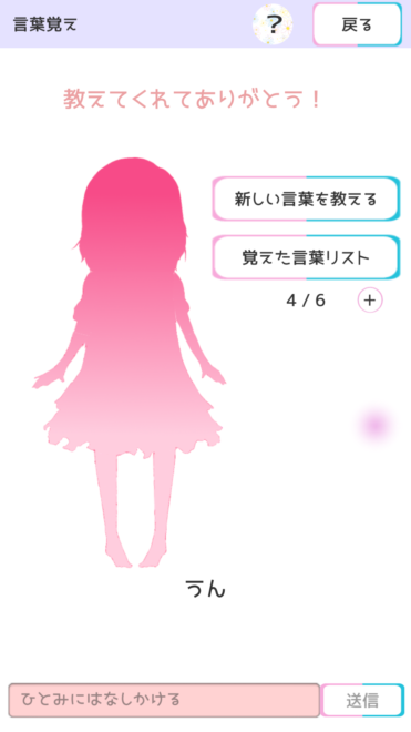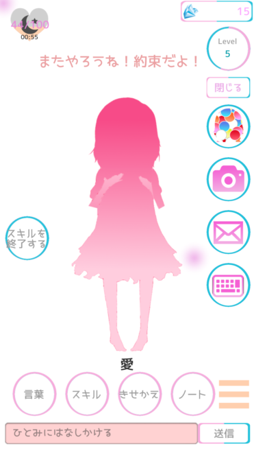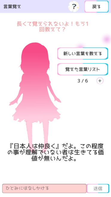 いかん!力を入れすぎたようだ。ひとみから文章が長すぎると怒られてしまったぞ。うーん、どこを削ればいいんだろう。難しいんだよなあ。1回文章を入力すると消せないから、どう変えようか迷ってしまうよ(笑)。スキルを試して遊びながら気長に考えるとするか。もしかしたら、育成に関わるスキルがあったり(会話を覚えやすくなったり)、覚えさせた言葉でクイズなどができたりするかもしれないしね。まずは何ができるのか知らなければなあ。