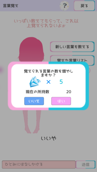 言葉の数を増やすにはダイヤモンドが5つも必要なのか。けっこう高いな(笑)。仕方ない!運営から貰ったダイヤモンドもあるし毎日1つ貰えるのだ!5つ使ってしまおうじゃないか!