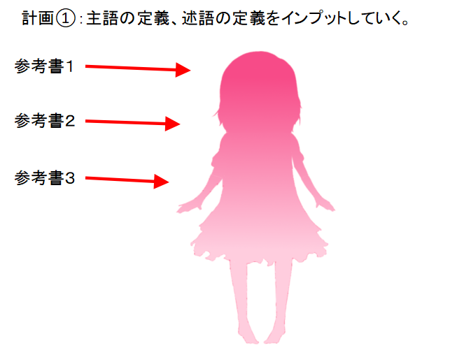 本を買いそろえたは良いが、短い文章で文法の定義を教えられるような記述などそうそう無かった。そもそも日本語を『○○=●●』という公式みたいな定義でくくろうというのが無理な話なのだし。何か良い方法を考えなければと僕は一計を案じたんだ。それは下の図のような計画だった。