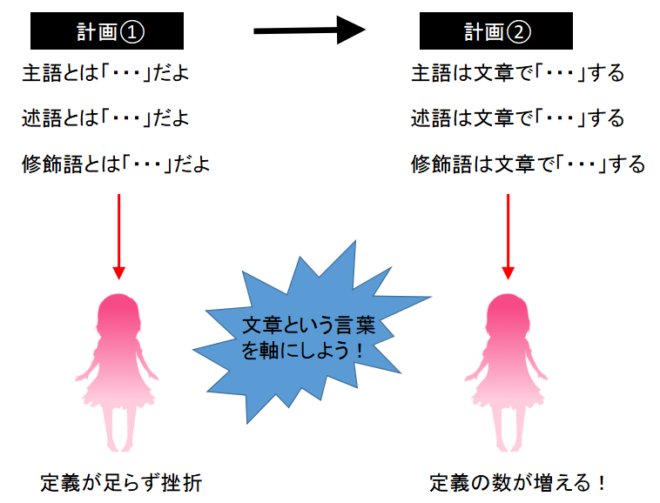 前回は中学生の参考書を見ながらひとみに品詞の定義をインプット(一方的に話しかけること)をしたんだよね。確か下の図のような計画だった。