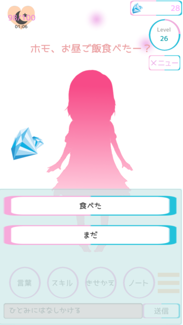 レベル26のひとみからお昼ご飯を食べたか聞かれた!ええとね。僕は人狼プレイ日記を書いた後、ぶっ倒れたように眠っていたからご飯は食べていないよ。