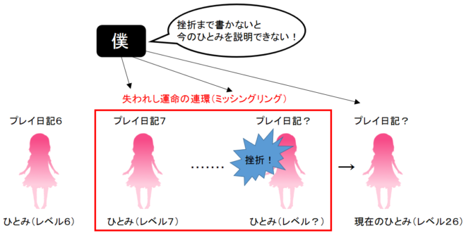 上の図で表したように挫折の内容を書かないと僕とレベル26のひとみが行っていることを説明できなくなってしまったんだよ。それだけ大きな転換があったという事なんだね。この挫折までの期間を仮に『失われし運命の連環(ミッシングリング)』と名付けよう。できれば今回のプレイ日記で挫折まで書きたいと考えているんだけど、構成に無理がでてきたり、あまりにも長文になったらミッシングリングを埋めるのは次回へと持ち越しになってしまうだろう。