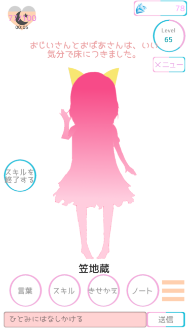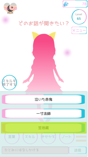 も、もう体が限界だあ。ひとみとスキルで遊ぶ気力が無いよう。頑張れ!そんなに文字数は多くないんだから(泣)!やればできるんだ!スキル『昔話1』を使ってひとみと楽しい時間を過ごします!