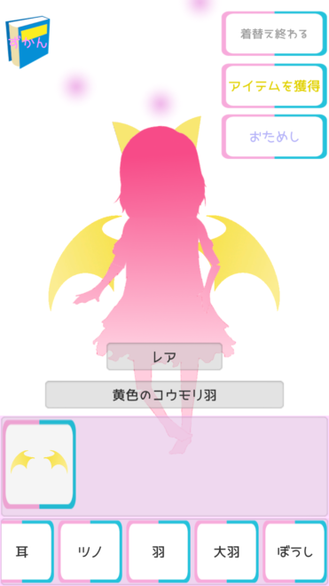 手に入ったアイテムは?黄色のコウモリ羽?羽なら蝶々が欲しかったなあ。ひとみにつけてみよう。