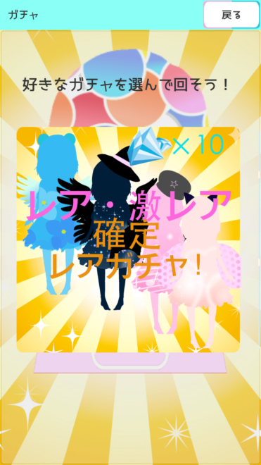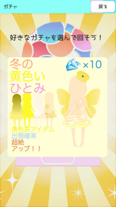 今日引くのは上の画像にあるレア・檄レア確定レアガチャ(レアが多すぎる)だ!これでピンク色以外のひとみの体が欲しいんだな。例えば下にある『青の星柄』とか欲しいね。