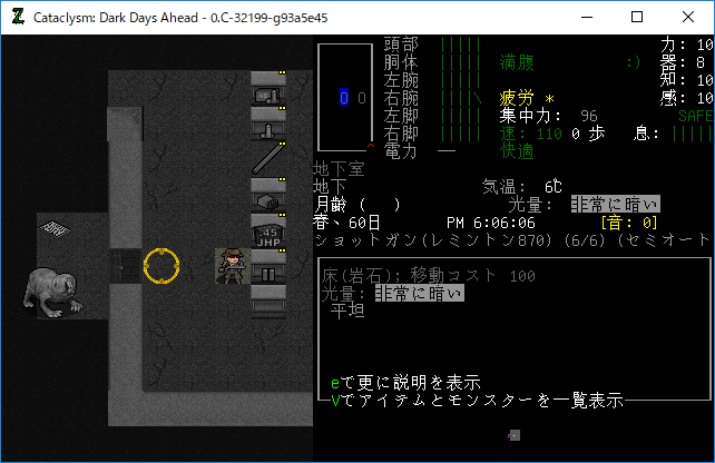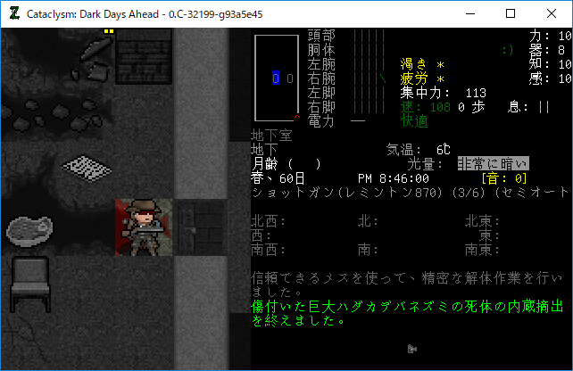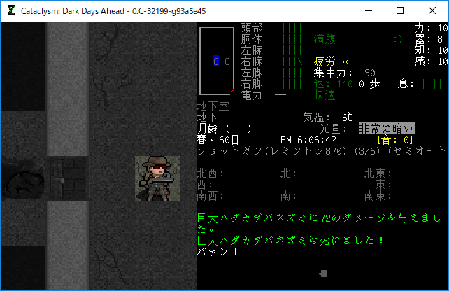 射撃コマンド『f』の狙撃レベル3『p』を駆使して巨大ハダカデバネズミを撃破。やっぱりショットガンは強いよなあ。すぐ弾切れになるし音がゾンビの大群を呼び寄せるから使用は控えていました。