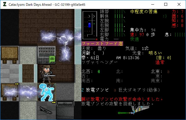 幸いにも衣類に損傷はなかったようです。だけど能力値の低下と苦痛が酷い。ふと立ち寄ったファーストフード店に放電ゾンビがいるなんて考えもしなかったよ。