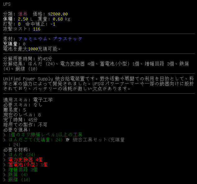 これからはUPSを5~6個持ち歩いてレーザー銃を主力武器にしたい。だけどUPSを大量生産するには多くの部品が必要になります。ショッピングモールの電子機器を全て回収しておくべきだったと後悔している。
