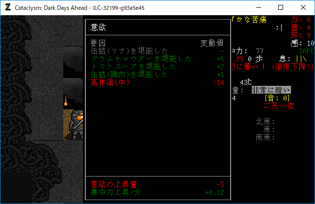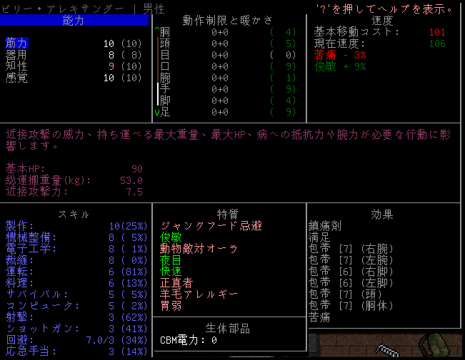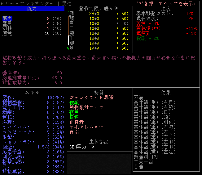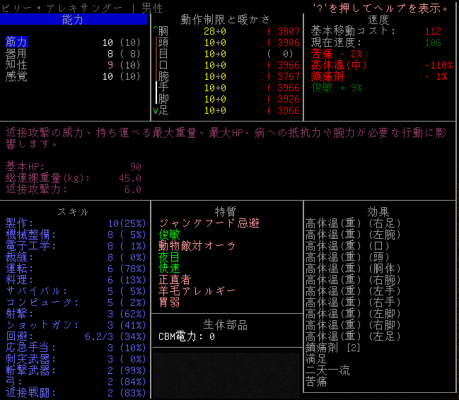 能力値を確認したところ苦痛が軽減されてきたぞ。CDDAのキャラクターは体もタフだが精神も強靭だな。世界はゾンビだらけになった、危険な怪物が至る所で増殖している、生存者を探しても見つからない、そして意味もなく炎に焼かれたのです。発狂してもおかしくない状況なのに何が彼らを突き動かしているのだろうか。