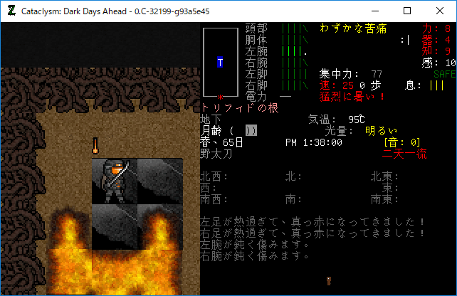 Cataclysmのプレイ日記を始めます。トリフィドの森の地下へやってきました。私の知識不足により炎の地形に飛び込んでしまう(上の図)。このままでは命に関わるかもしれません。