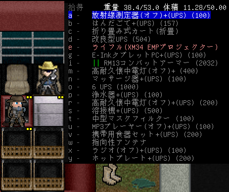 出発前に持ち物を確認しておこう。UPS互換充電ステーションの中身は上の画像だ。いちおうレーザーライフル(X34)を持って行きます。ライフルスキルが低いから使わないだろうけど。