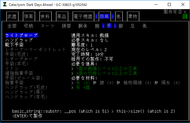 現在は手にハンドラップを装備しています。ハンドラップよりも暖かそうなのはライトグローブかな?まあ他に作成する選択肢は無いからライトグローブを作成します。